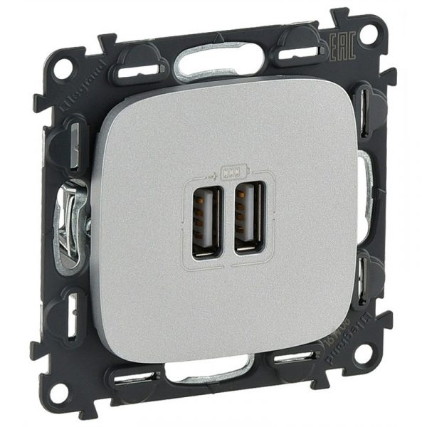 Зарядное устройство с двумя USB-разьемами 240В/5В 1500мА. С лицевой панелью. Алюминий. Valena ALLURE