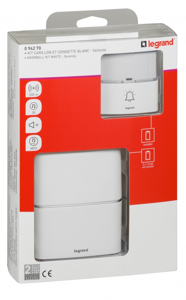 Звонок беспроводной Legrand комплект "Премиум" 30 рингтонов + Mpr3, дальность 200 м, IP54, белый