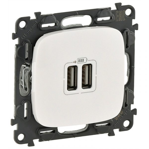 Зарядное устройство с двумя USB разъемами 100-240 ВA, 50-60 Гц, 5 В — 2400 мА. Соответствует стандарту МЭК 62684-2011-01. Для быстрой зарядки мобильных телефонов, планшетов, МР3 и МР4 плееров. Потребление в режиме ожидания < 0,1 Вт, класс II, SELV. Соответствует директиве EEC о стандартах зарядки для мобильных устройств и унификации зарядных устройств для мобильных телефонов. Устанавливается в коробку скрытого монтажа глубиной минимум 40 мм. Поставляется без шнуров.